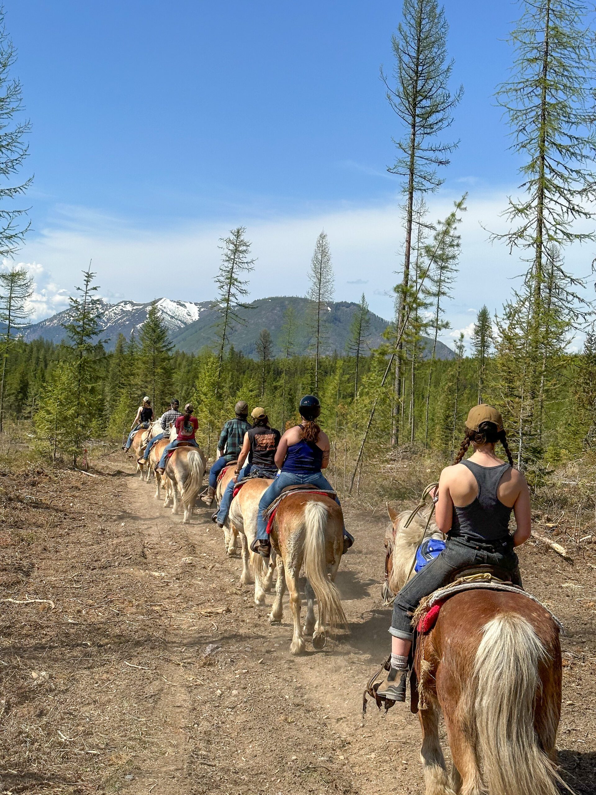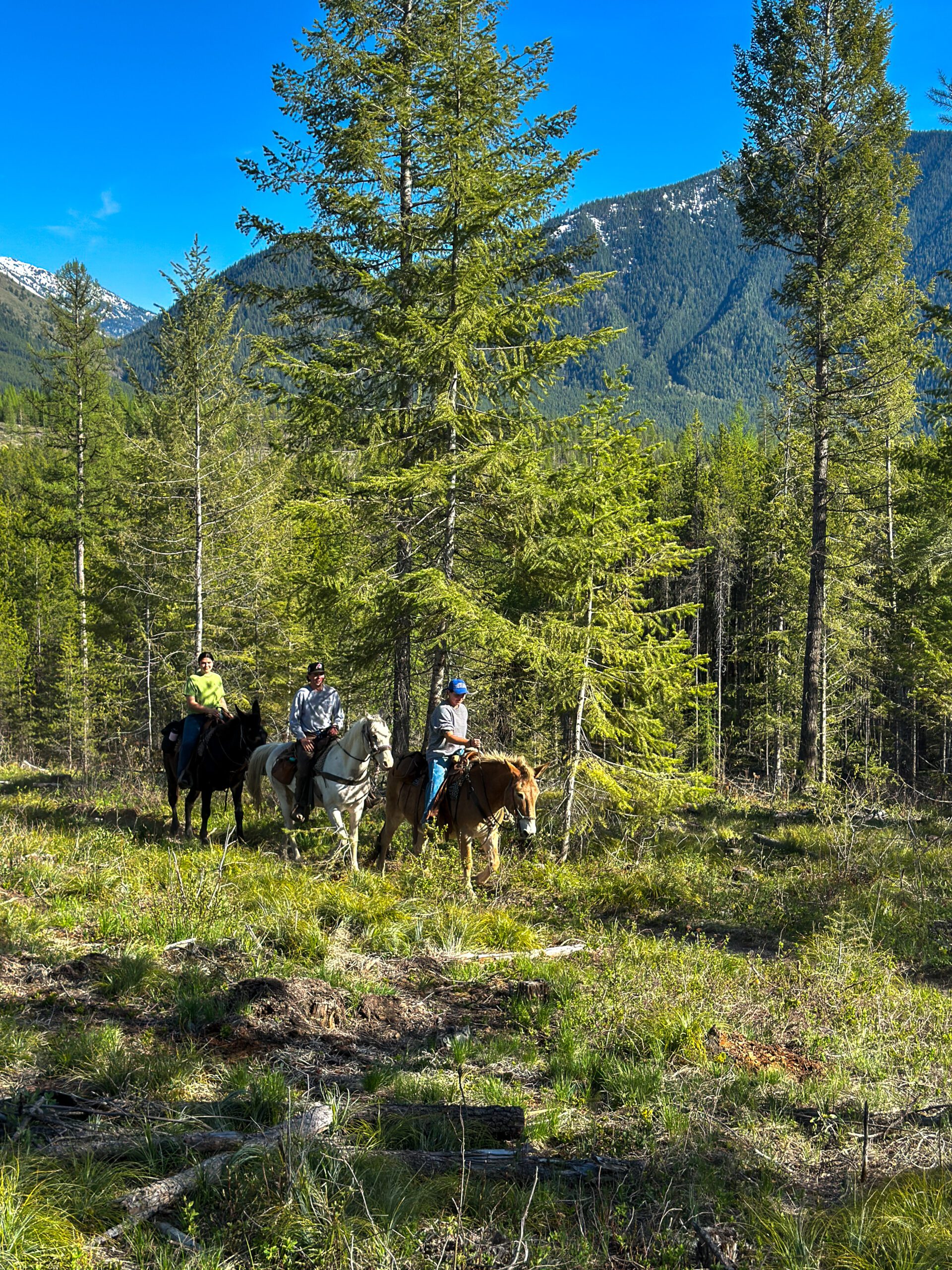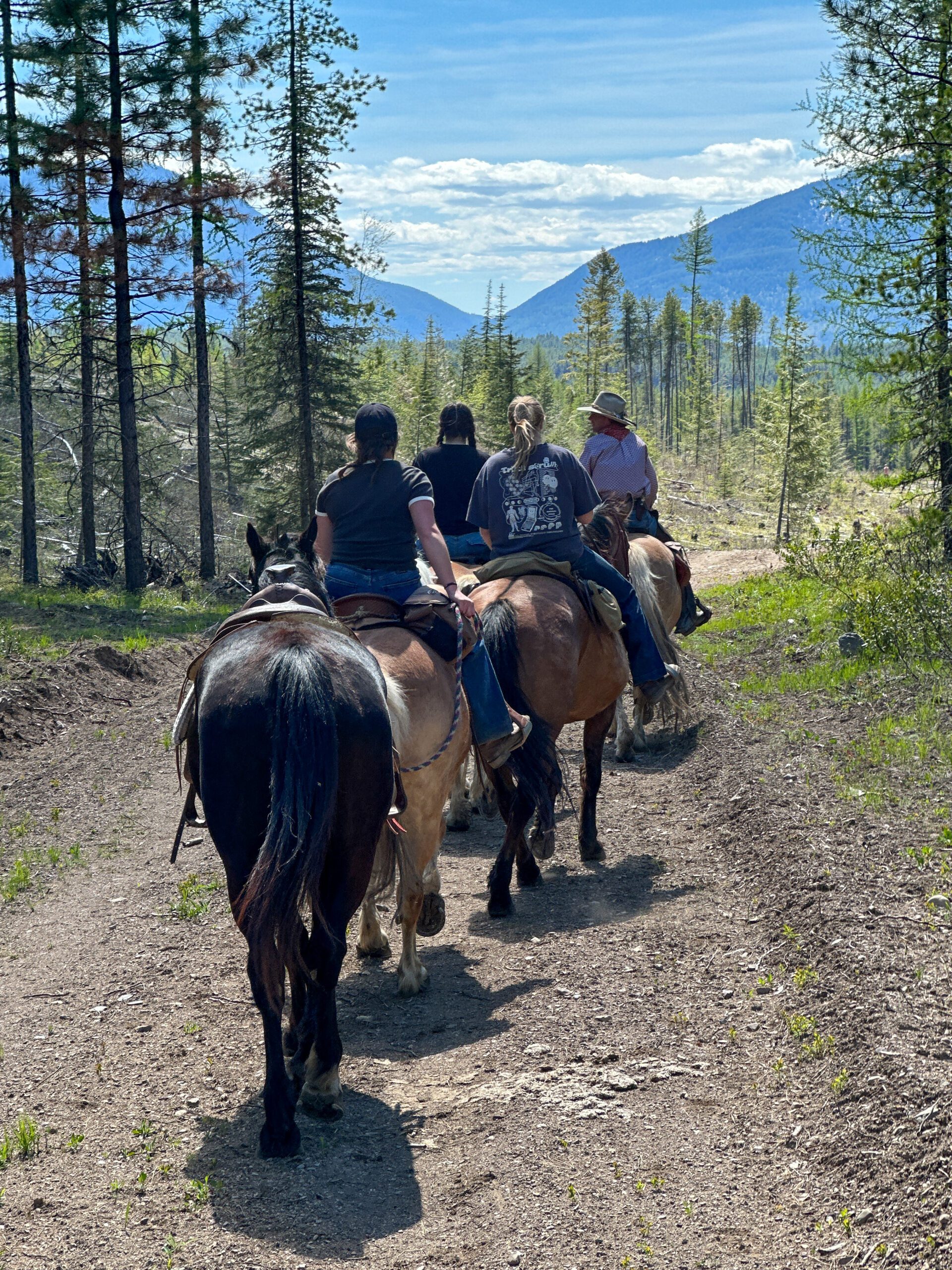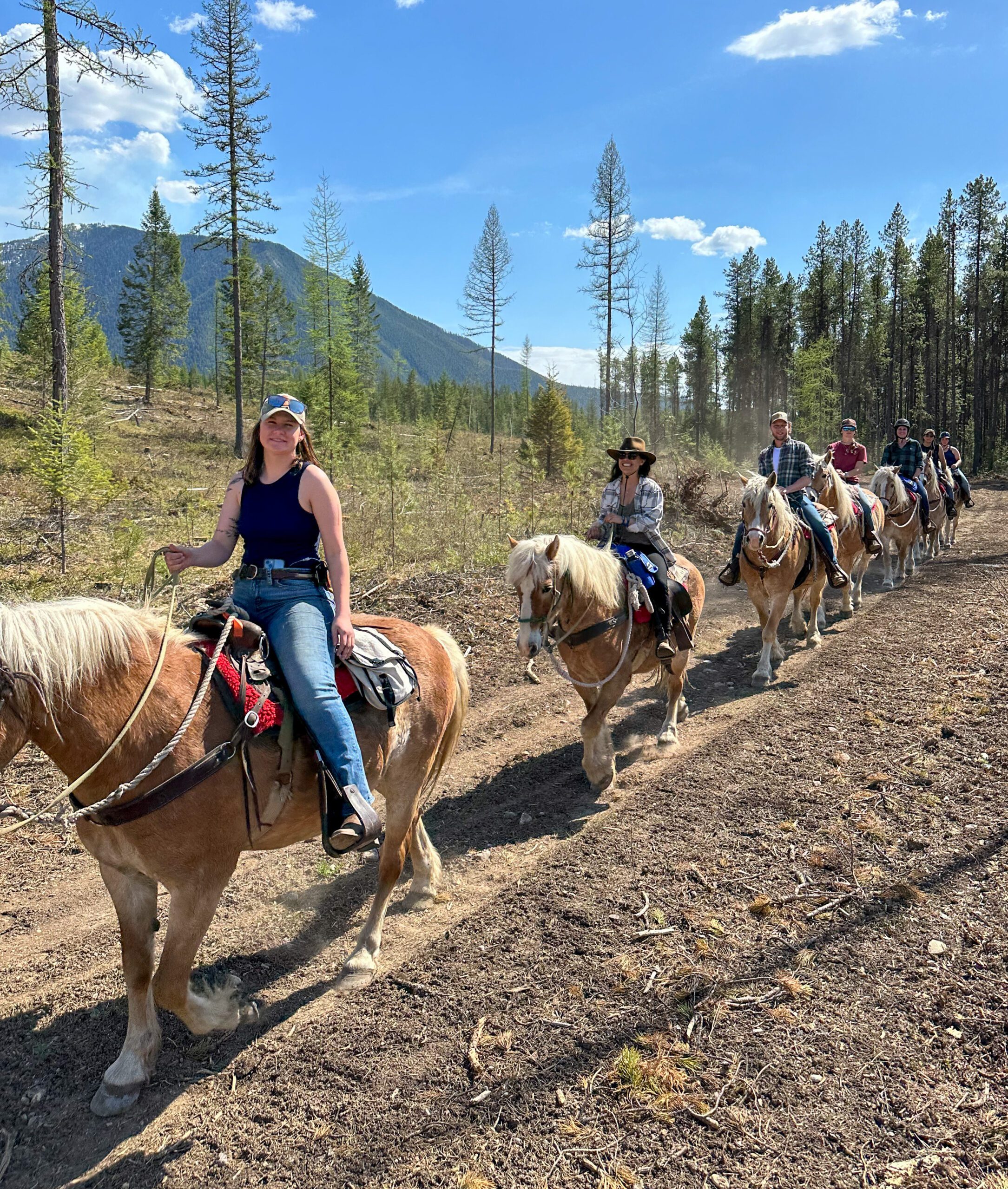 This three hour trail brings you further into Flathead National Forest and affords views of Strawberry and Desert Mountain. Traverse roughly 2.5 miles of lodgepole pine forest, sections of clear cutting, and lush cottonwood stands as you gently ascend to the overlook. Dismount and stretch your legs while enjoying the views of Desert Mountain and Strawberry Mountain. Saddle up and continue another couple of miles on this loop back to the corral. Keep an eye out for huckleberries, deer, and bear!