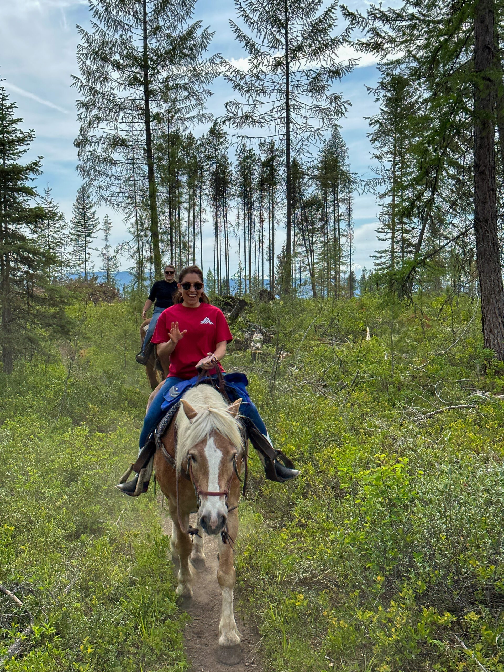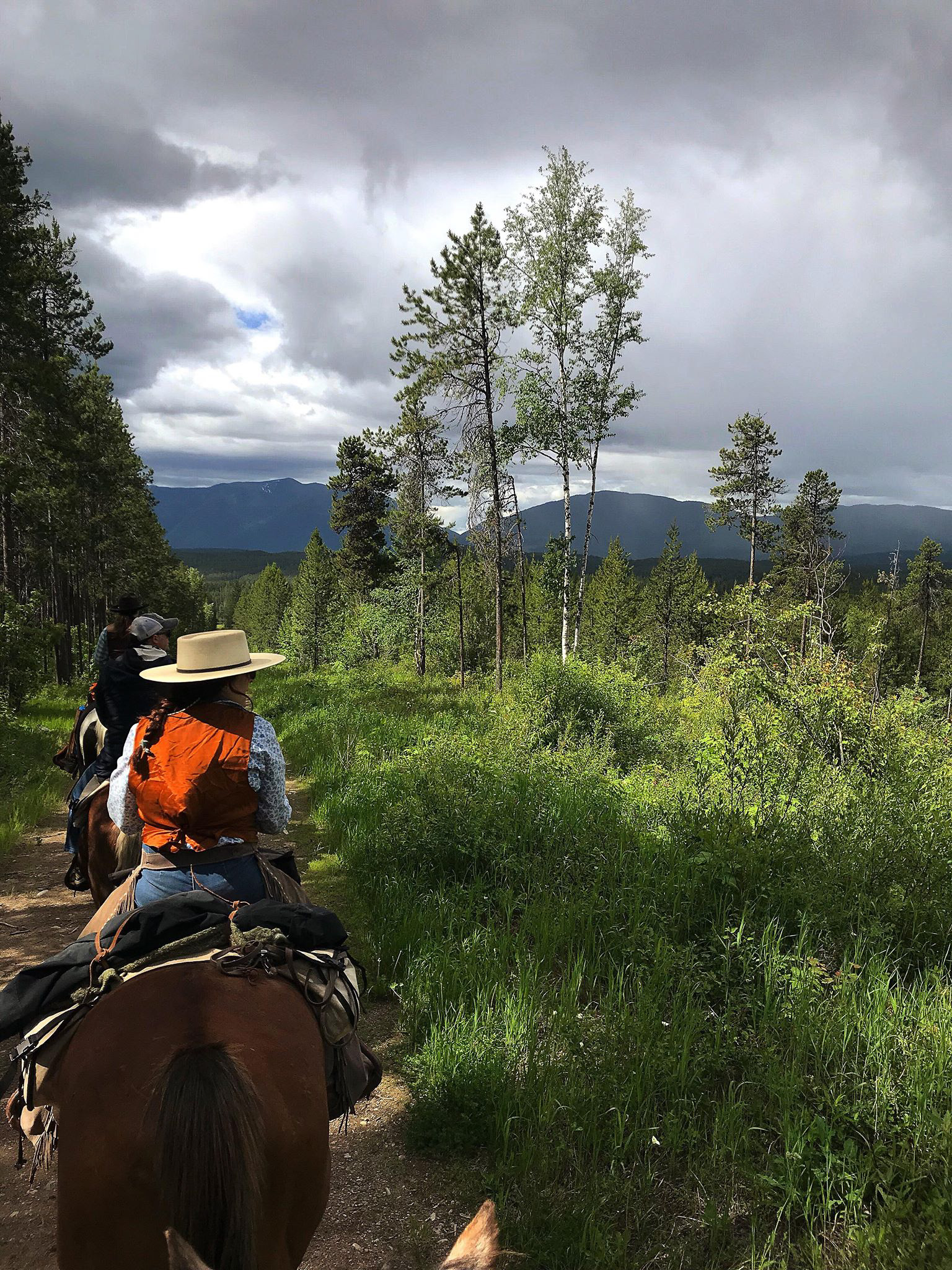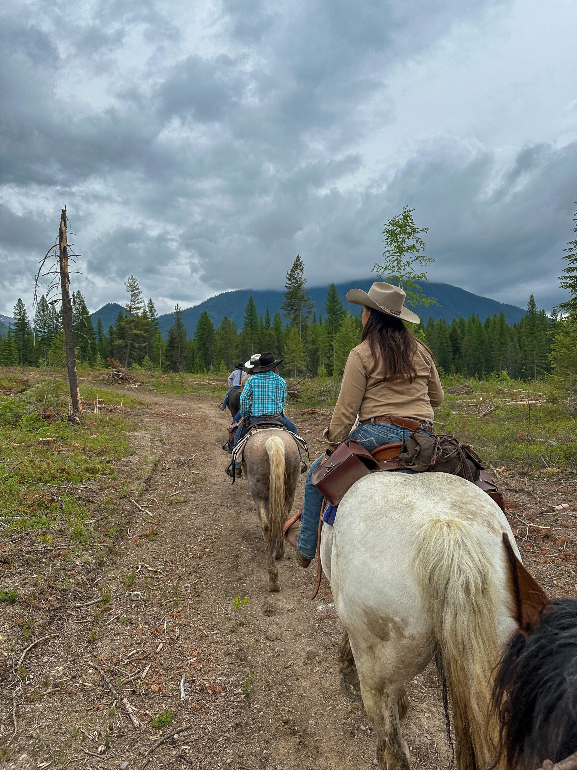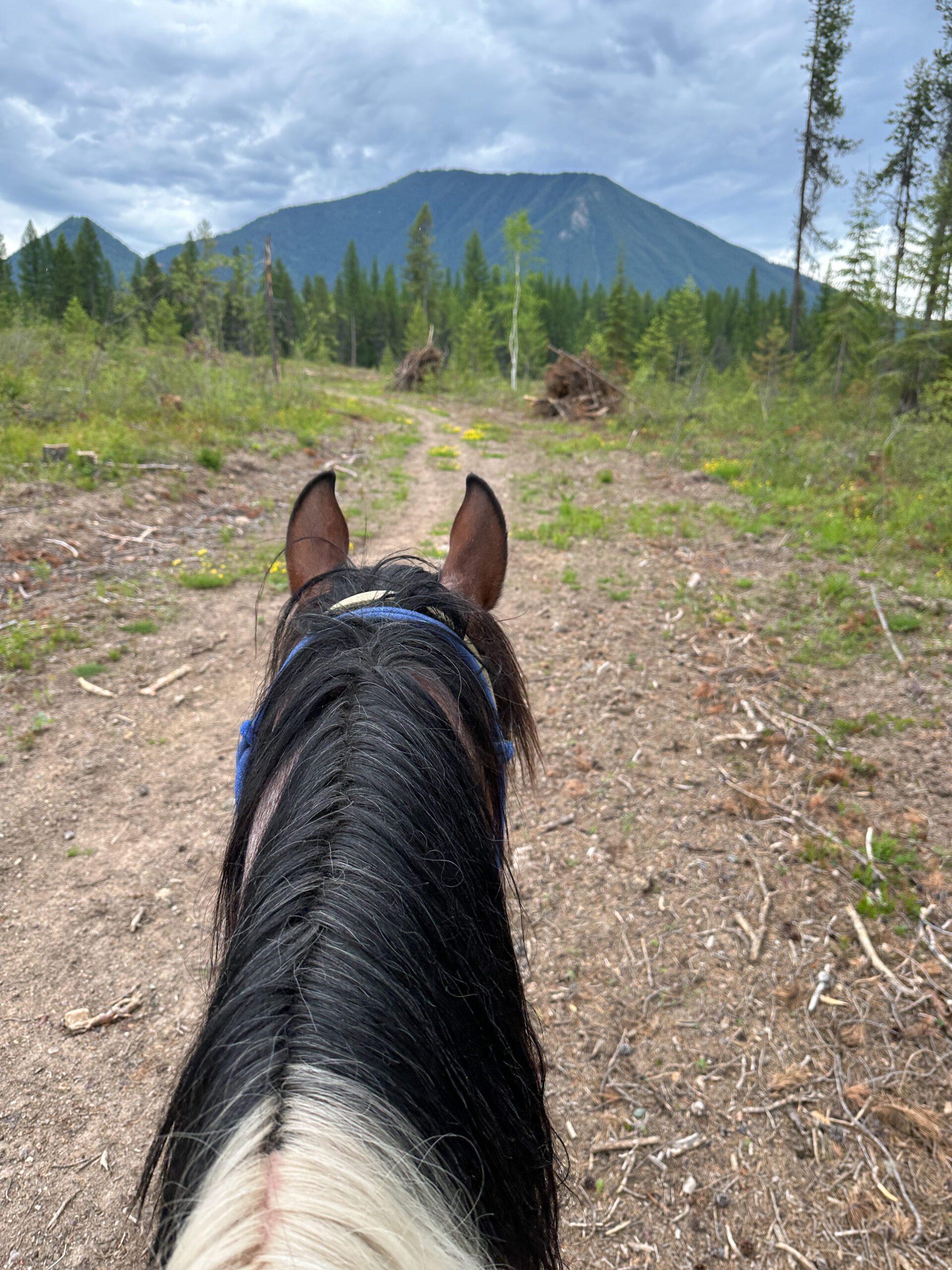 This three hour trail brings you further into Flathead National Forest and affords views of Strawberry and Desert Mountain. Traverse roughly 2.5 miles of lodgepole pine forest, sections of clear cutting, and lush cottonwood stands as you gently ascend to the overlook. Dismount and stretch your legs while enjoying the views of Desert Mountain and Strawberry Mountain. Saddle up and continue another couple of miles on this loop back to the corral. Keep an eye out for huckleberries, deer, and bear!