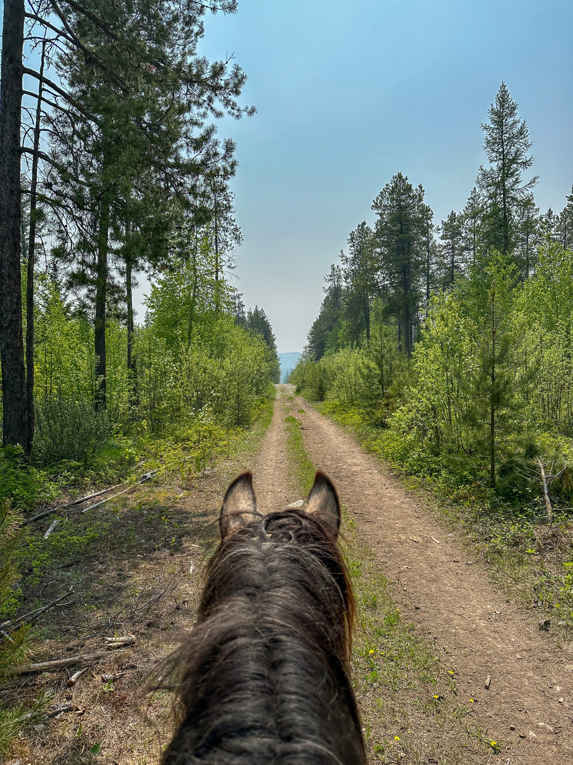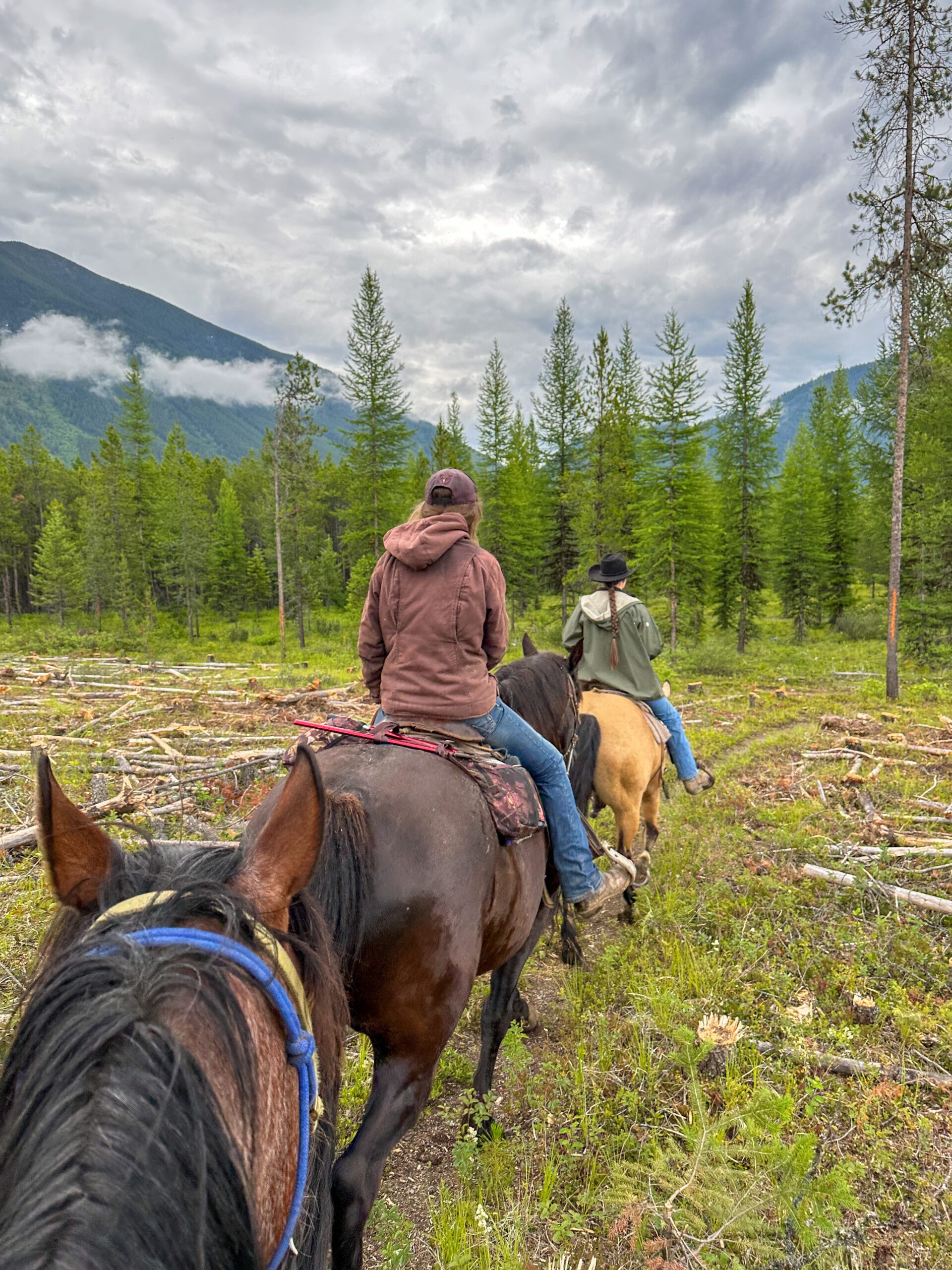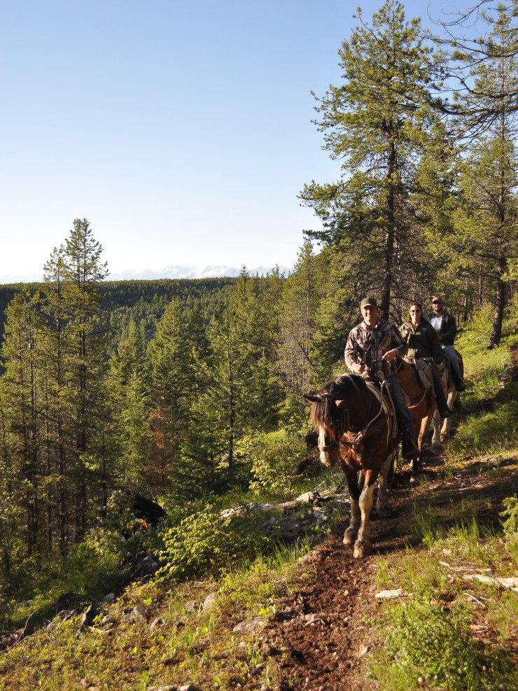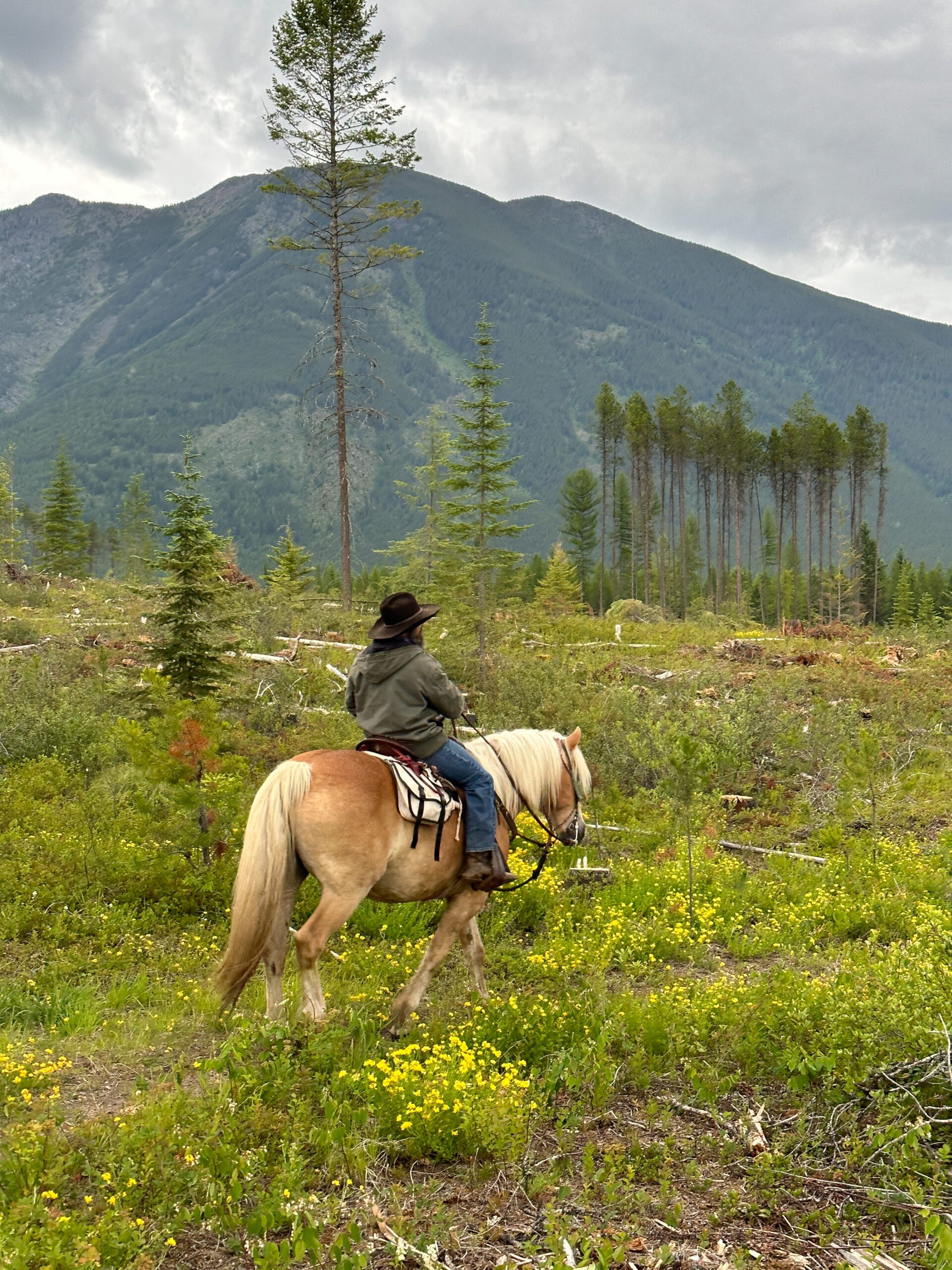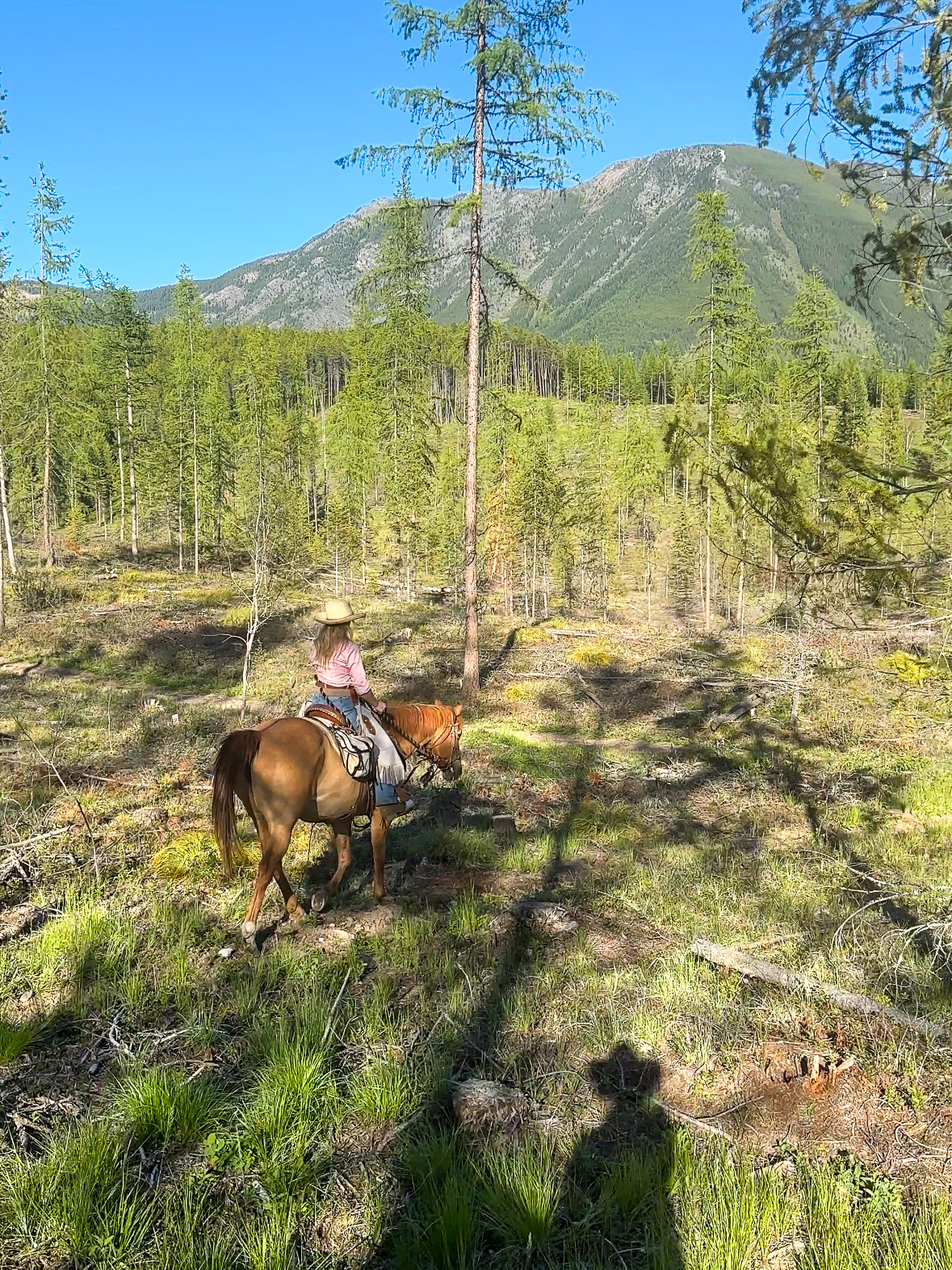 This three hour trail brings you further into Flathead National Forest and affords views of Strawberry and Desert Mountain. Traverse roughly 2.5 miles of lodgepole pine forest, sections of clear cutting, and lush cottonwood stands as you gently ascend to the overlook. Dismount and stretch your legs while enjoying the views of Desert Mountain and Strawberry Mountain. Saddle up and continue another couple of miles on this loop back to the corral. Keep an eye out for huckleberries, deer, and bear!